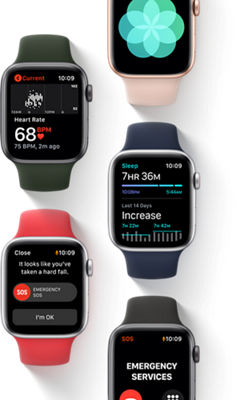 2. Irregular rhythm notification requires Apple Watch Series 3 or later (not including Apple Watch SE) with watchOS 6 or later and iPhone 6s or later with the latest version of iOS. It is not intended for use by people under 22 years old or those who have been previously diagnosed with atrial fibrillation (AFib). See apple.com/watch for compatibility details.
